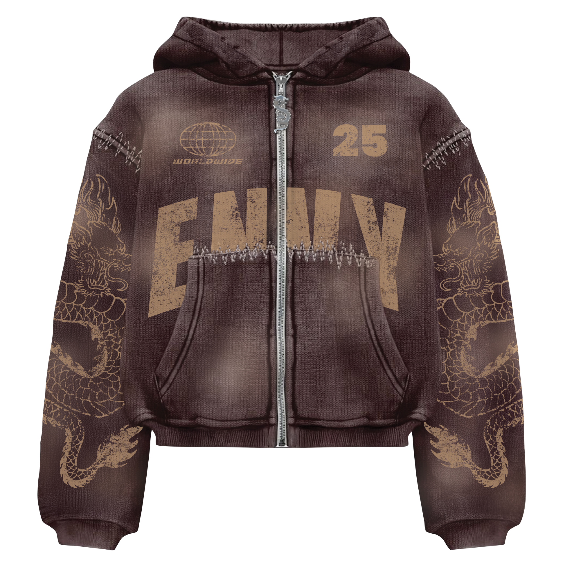 Crafted from heavyweight, washed brown fabric with a vintage fade, it features bold ENVY lettering and flame-detailed dragon artwork along both sleeves.
